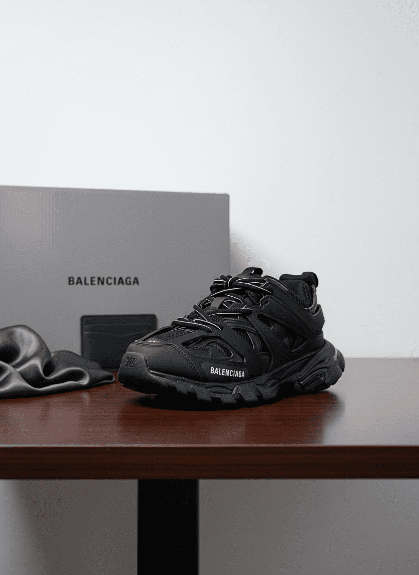 Balenciaga black tech sneakers feature mesh and synthetic leather panels, chunky cushioned sole, multi-layer futuristic design, unisex streetwear style, bold logo details, perfect for casual wear.