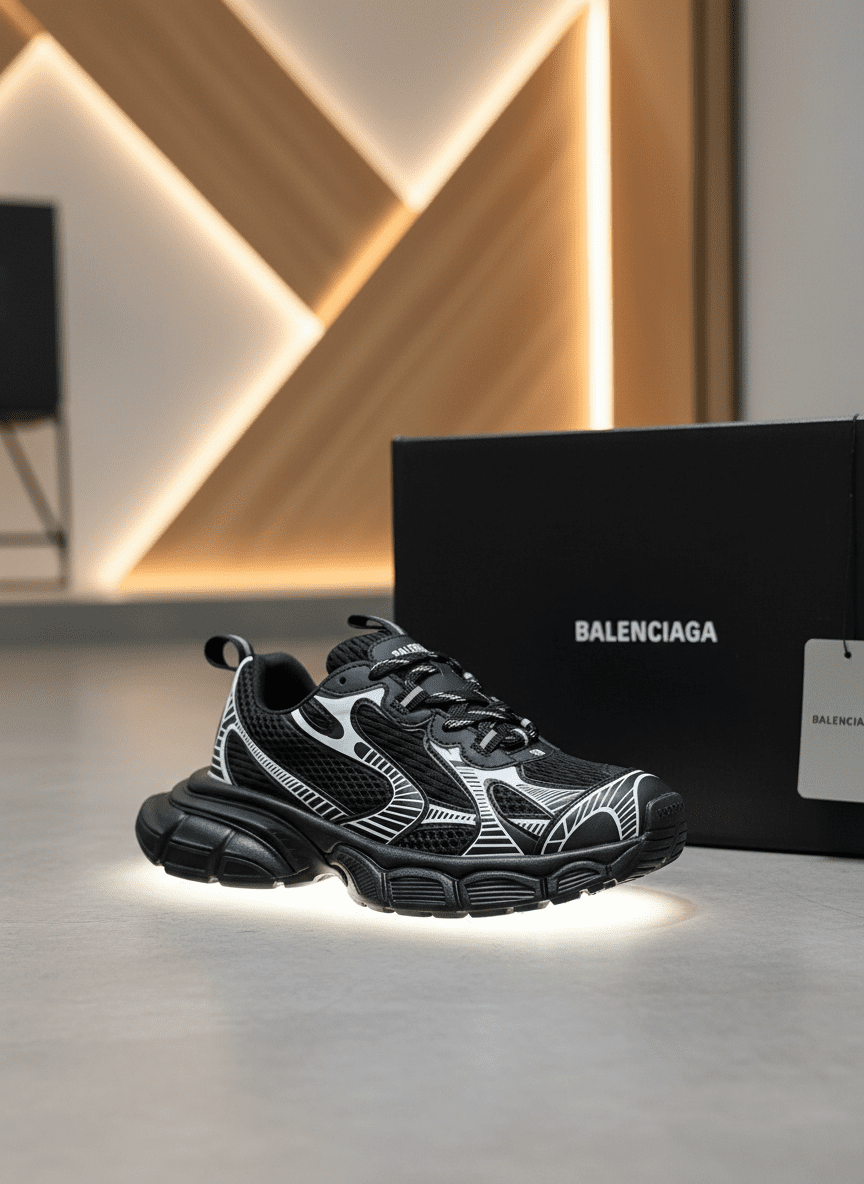Balenciaga Track Black White Sneakers with breathable mesh, chunky cushioned sole, geometric details, streetwear style, unisex design, ultra-comfortable and versatile for urban fashion.