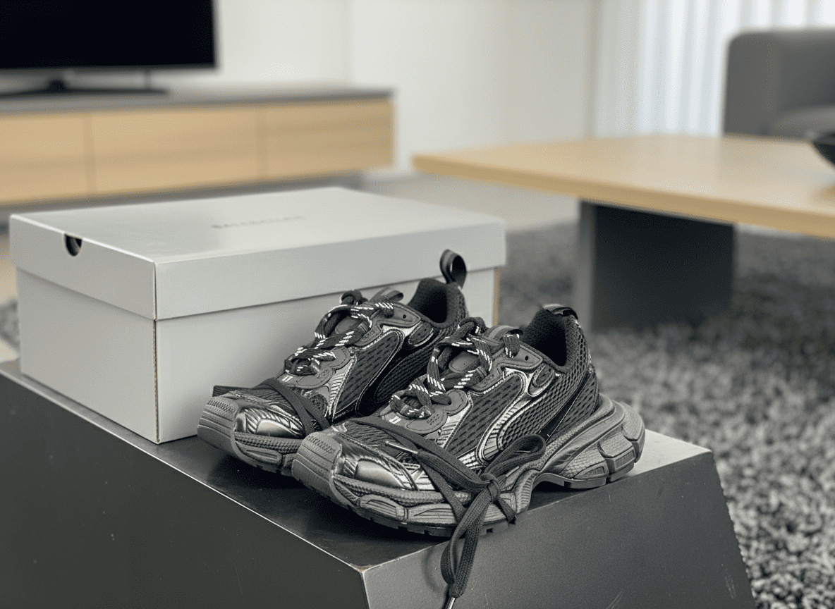 Balenciaga Track Black Sneakers feature mesh and shiny synthetic panels, chunky non-slip rubber sole, complex lace system, unisex futuristic design by Demna, perfect for casual or sporty street style.