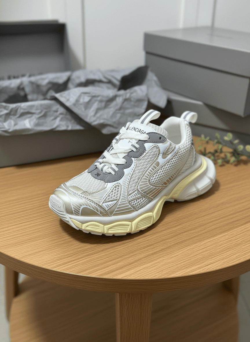 Balenciaga Track White Gold Sneakers, mesh and synthetic mix, chunky sole dad style, sleek design, unisex, trendy, durable, comfortable for daily wear, showcasing bold modern fashion.
