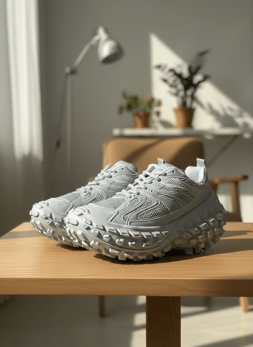 Balenciaga Track Light Gray Sneakers feature a mesh upper and chunky rubber sole with serrated tread. Trendy and unisex, offering comfort and style for casual daily wear and street fashion.
