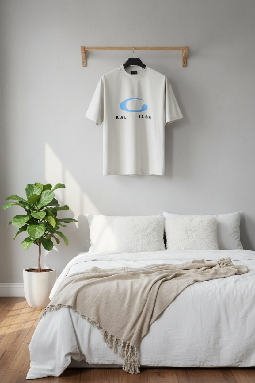 Balenciaga Off-White Oversized T-Shirt, soft breathable cotton, blue C logo with black lettering, unisex streetwear style, perfect for daily casual outfits.