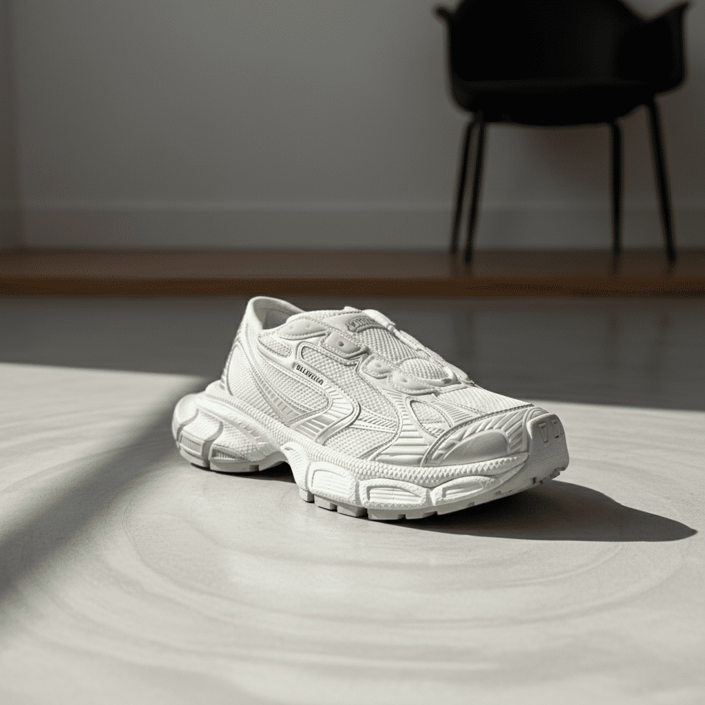 Balenciaga Track Sneakers Off-White Silver, mesh and metallic panels, chunky cushioned sole, unisex streetwear style, comfortable and modern, showcasing Balenciaga’s avant-garde design.