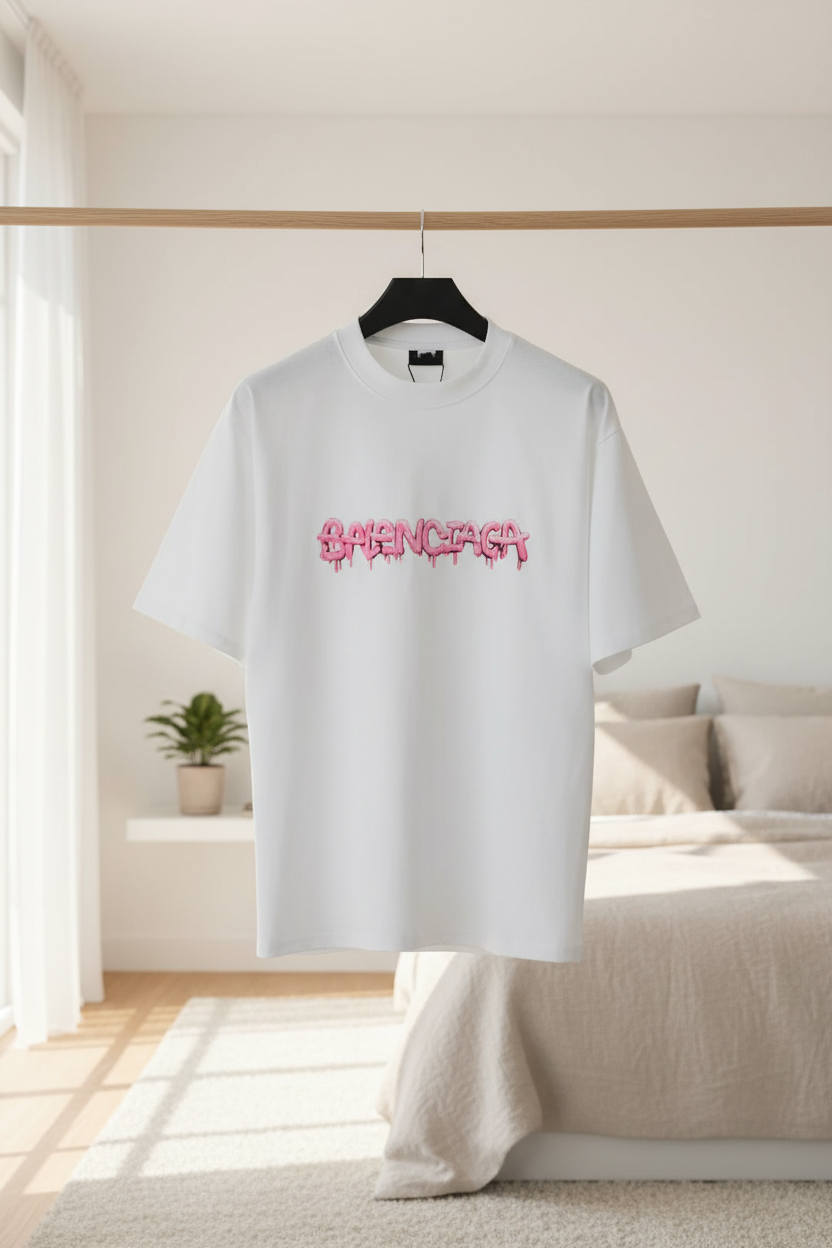 Balenciaga Paris Graffiti Logo T-Shirt, white cotton tee featuring bold pink 3D lettering, modern streetwear design, luxury casual fashion for men and women.