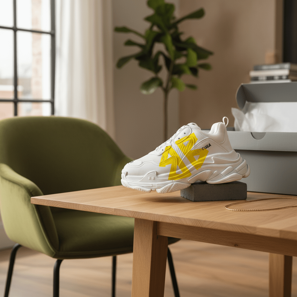 Balenciaga Triple S White Yellow Sneakers feature mesh and leather panel design, chunky sole for comfort, bold yellow logo, unisex style, perfect for streetwear and modern casual fashion.