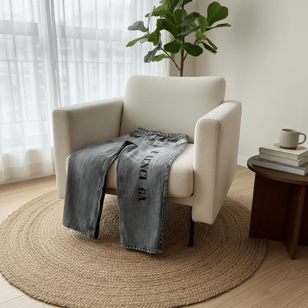 Balenciaga Classic Washed Blue-Grey Jeans, premium denim, side vertical logo detail, loose straight-leg cut, unisex design, streetwear vibe, stylish and comfortable for everyday fashion.