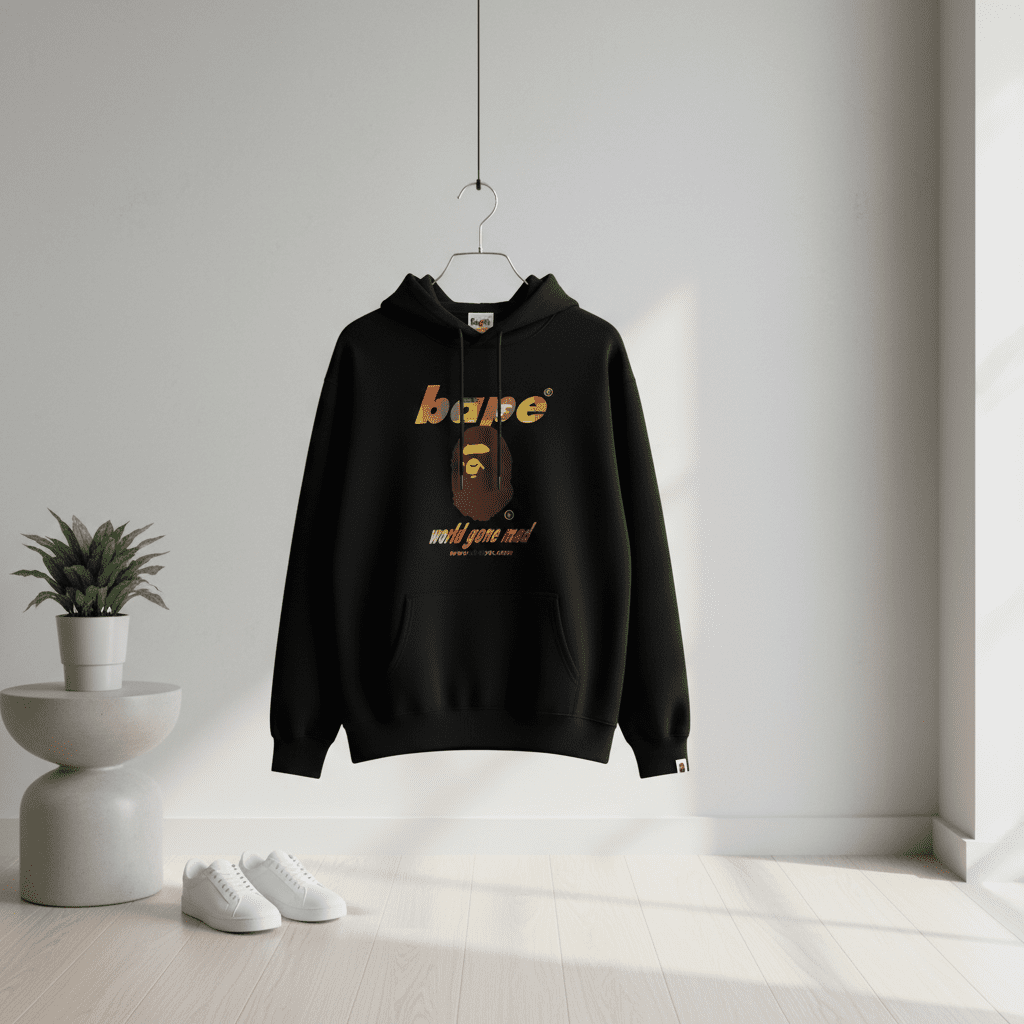 BAPE A Bathing Ape black hoodie with iconic Ape Head and “World Gone Mad” print, crafted from soft breathable cotton, featuring drawstring hood and kangaroo pocket for stylish streetwear comfort.