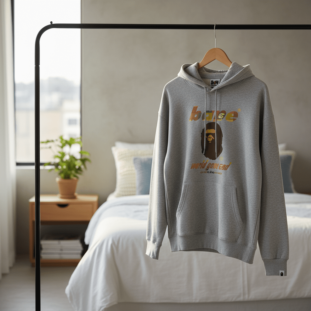 A Bathing Ape grey hoodie made from soft breathable premium cotton, featuring the iconic Ape Head and colorful logo print, drawstring hood with kangaroo pocket, unisex streetwear style.