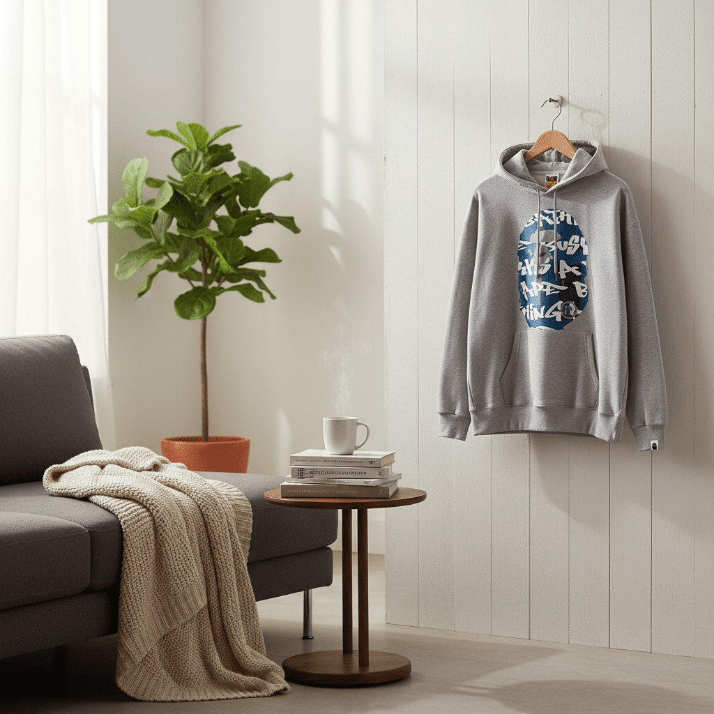 A Bathing Ape Grey Hoodie: soft breathable cotton, blue-white camo ape head print, drawstring hood, kangaroo pocket, streetwear style for men and women, perfect for casual urban outfits.