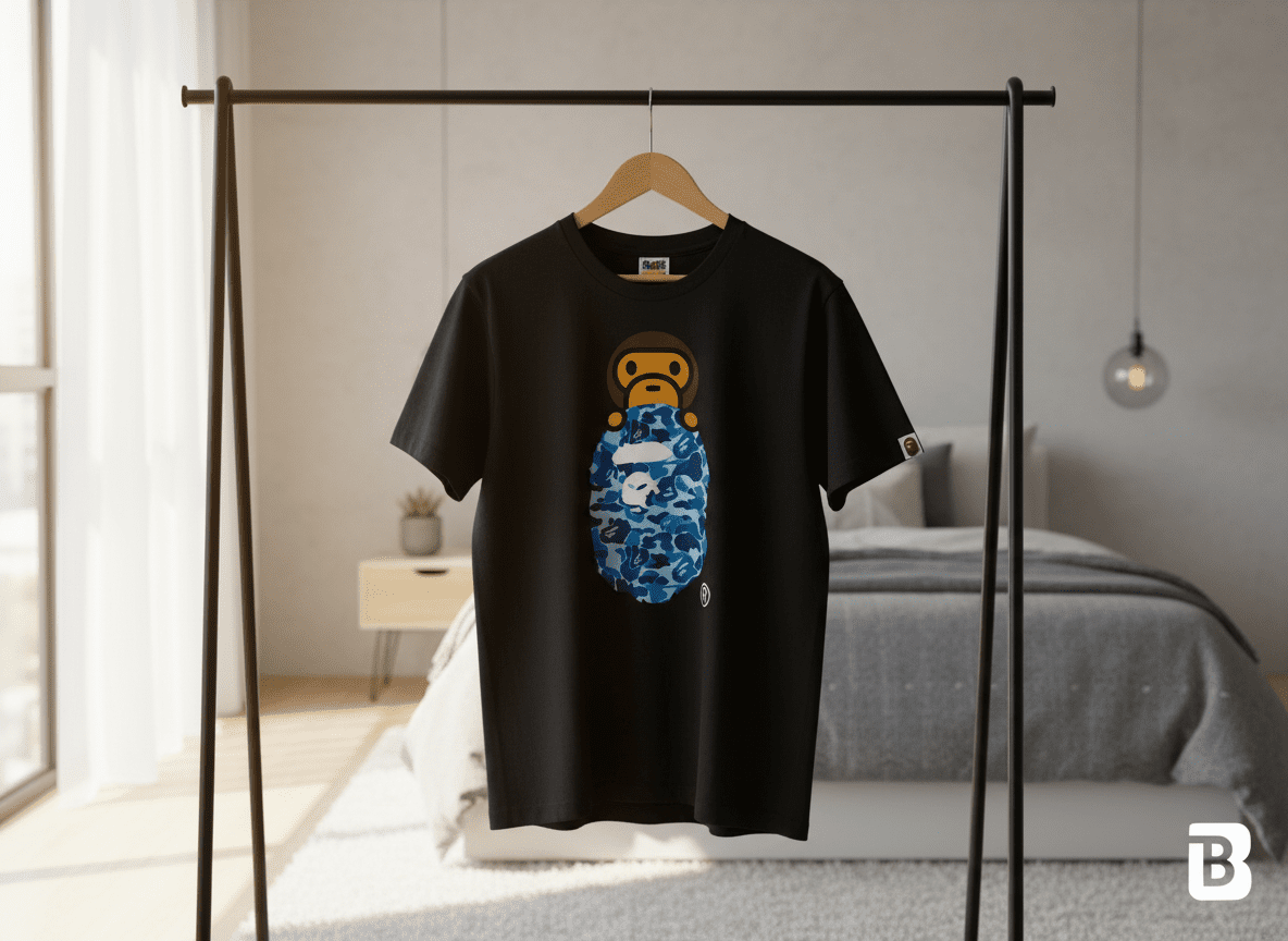 A Bathing Ape black T-shirt features blue camo Ape Head with pink “B” design, soft breathable cotton, sleeve logo tag, unisex streetwear style for trendy everyday outfits.