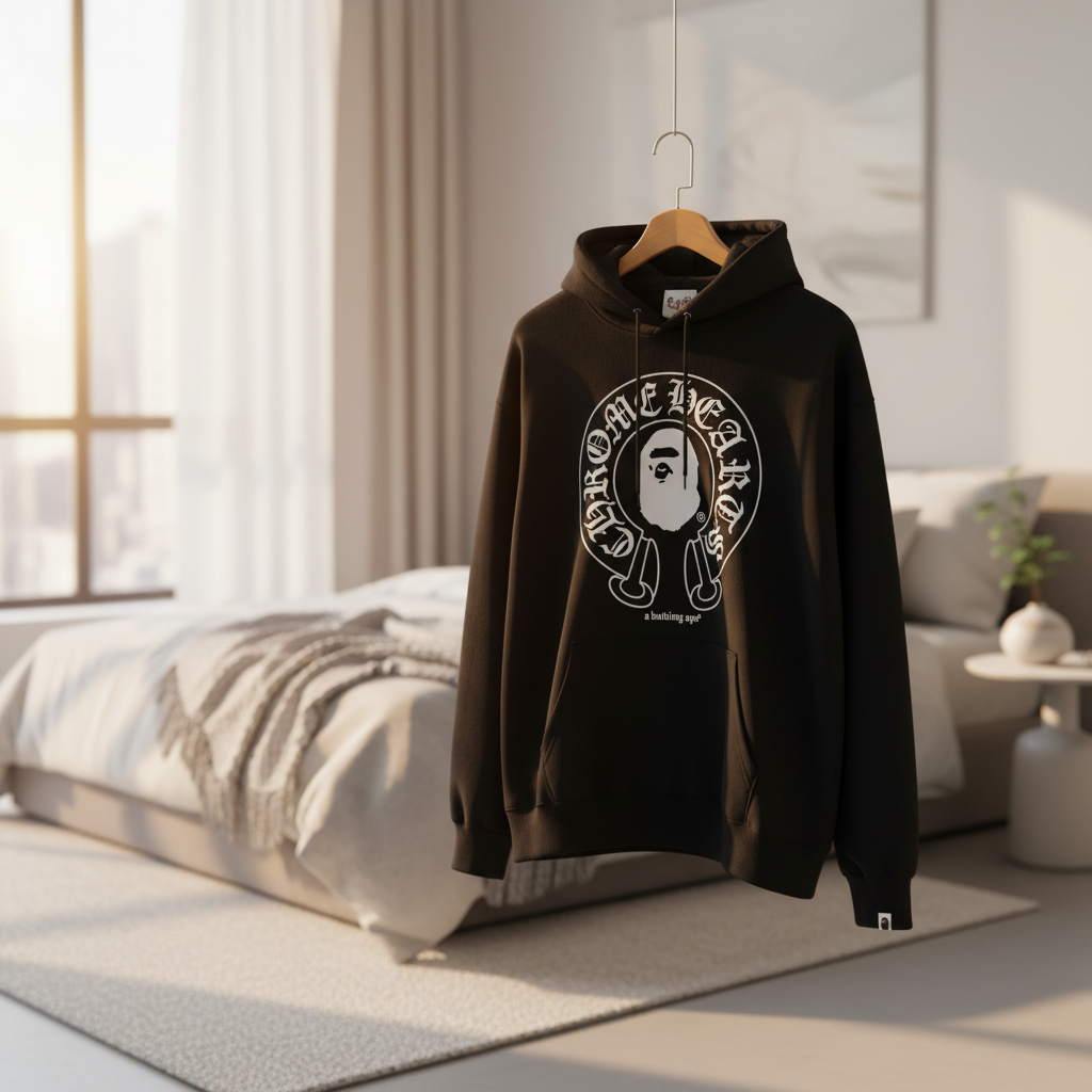BAPE x Chrome Hearts Black Hoodie, made from premium soft cotton, features iconic Ape Head and Chrome Hearts graphics, kangaroo pocket, drawstring hood, unisex streetwear for stylish comfort.