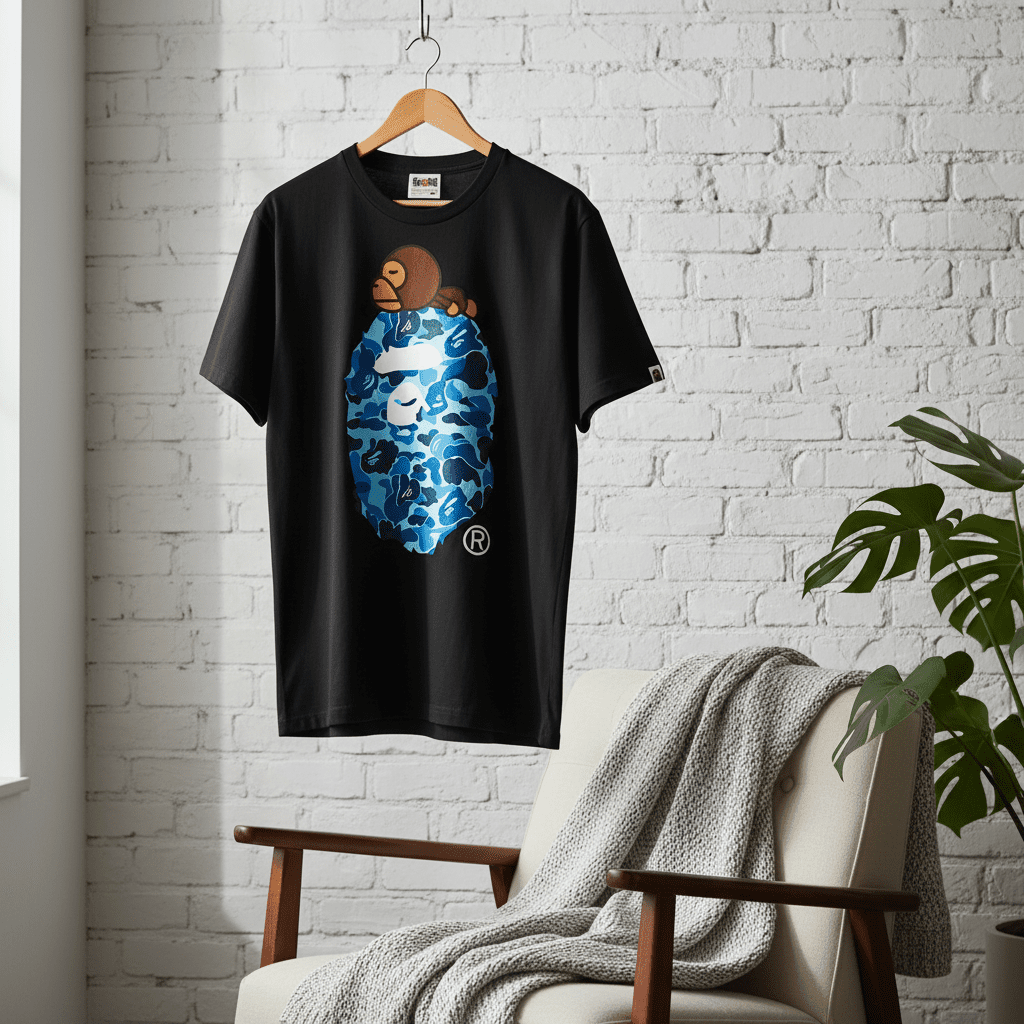 A Bathing Ape classic black cotton T-shirt with iconic blue camo ape head and small monkey design, breathable fabric, unisex streetwear style for casual daily fashion.
