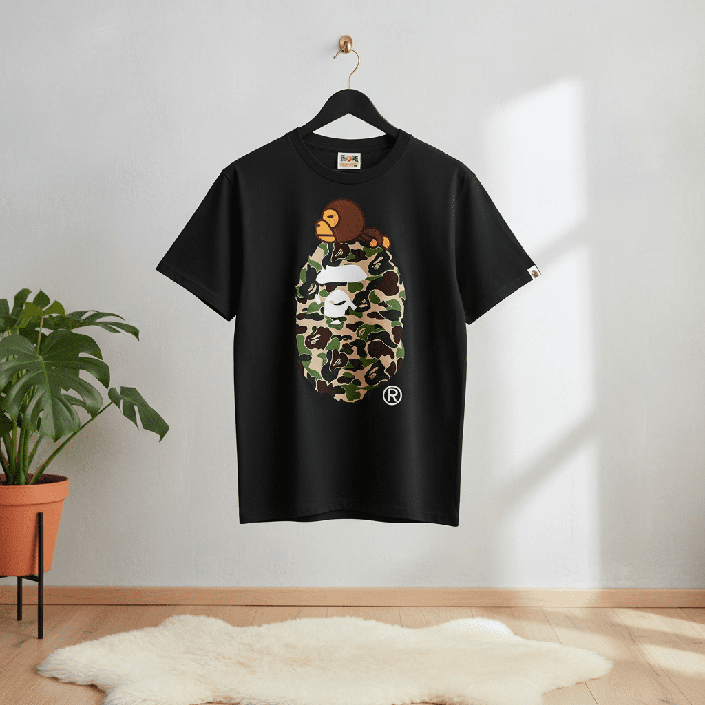 A Bathing Ape Camo Ape Head Black T-Shirt, soft breathable cotton, iconic camo ape and playful monkey print, brand logo on sleeve, unisex streetwear style for daily casual fashion.