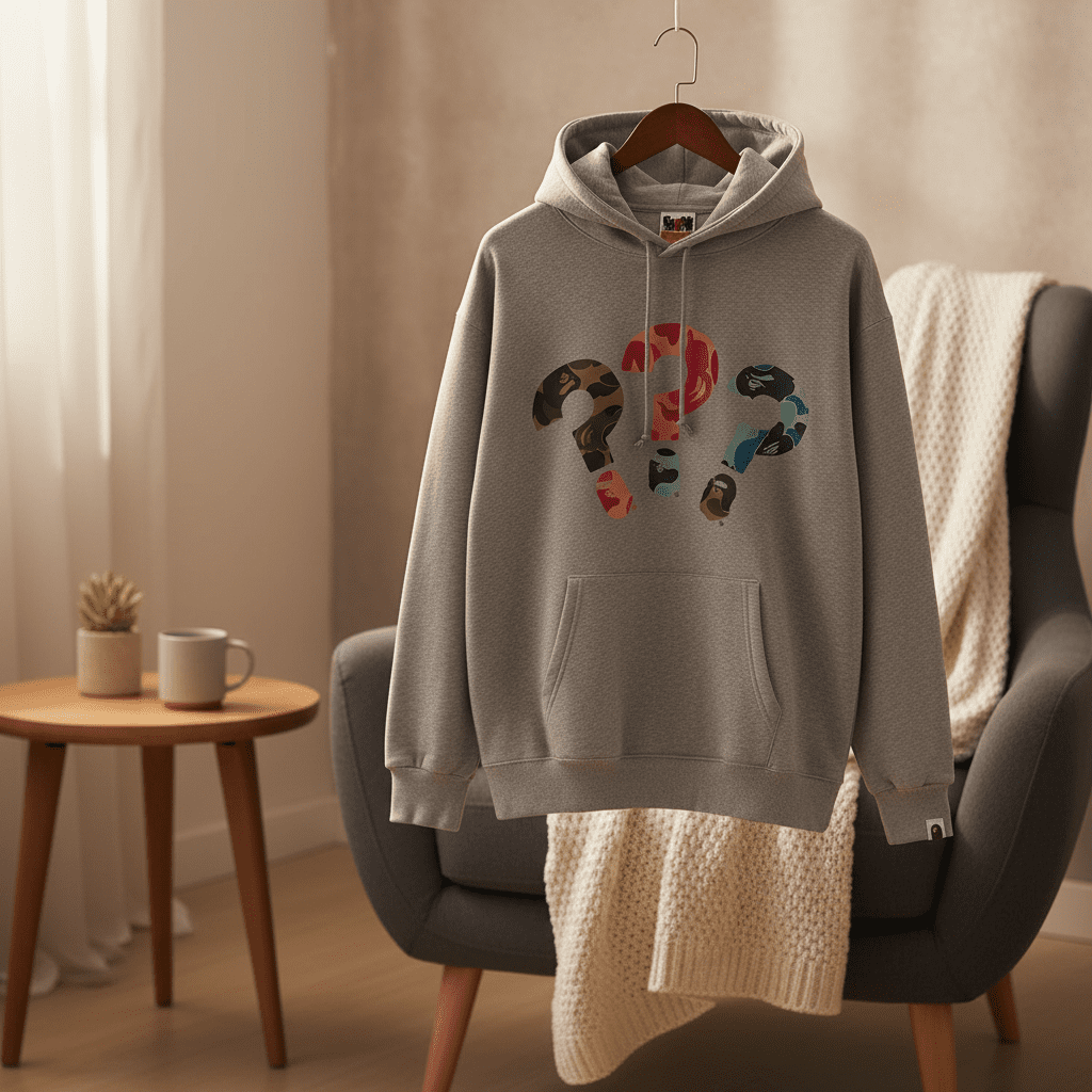 A Bathing Ape Grey Camo Question Mark Hoodie, cotton fabric, tri-color camo print, drawstring hood and kangaroo pocket, unisex streetwear style, trendy and iconic fashion piece.