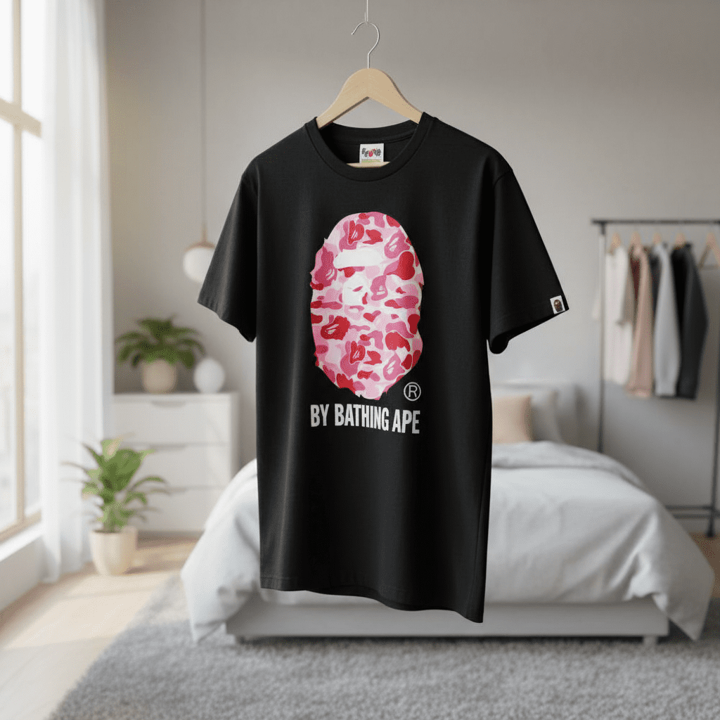 A Bathing Ape classic black T-shirt with pink ape head print, soft cotton fabric, unisex streetwear style, perfect for daily casual outfits and expressing bold urban fashion.