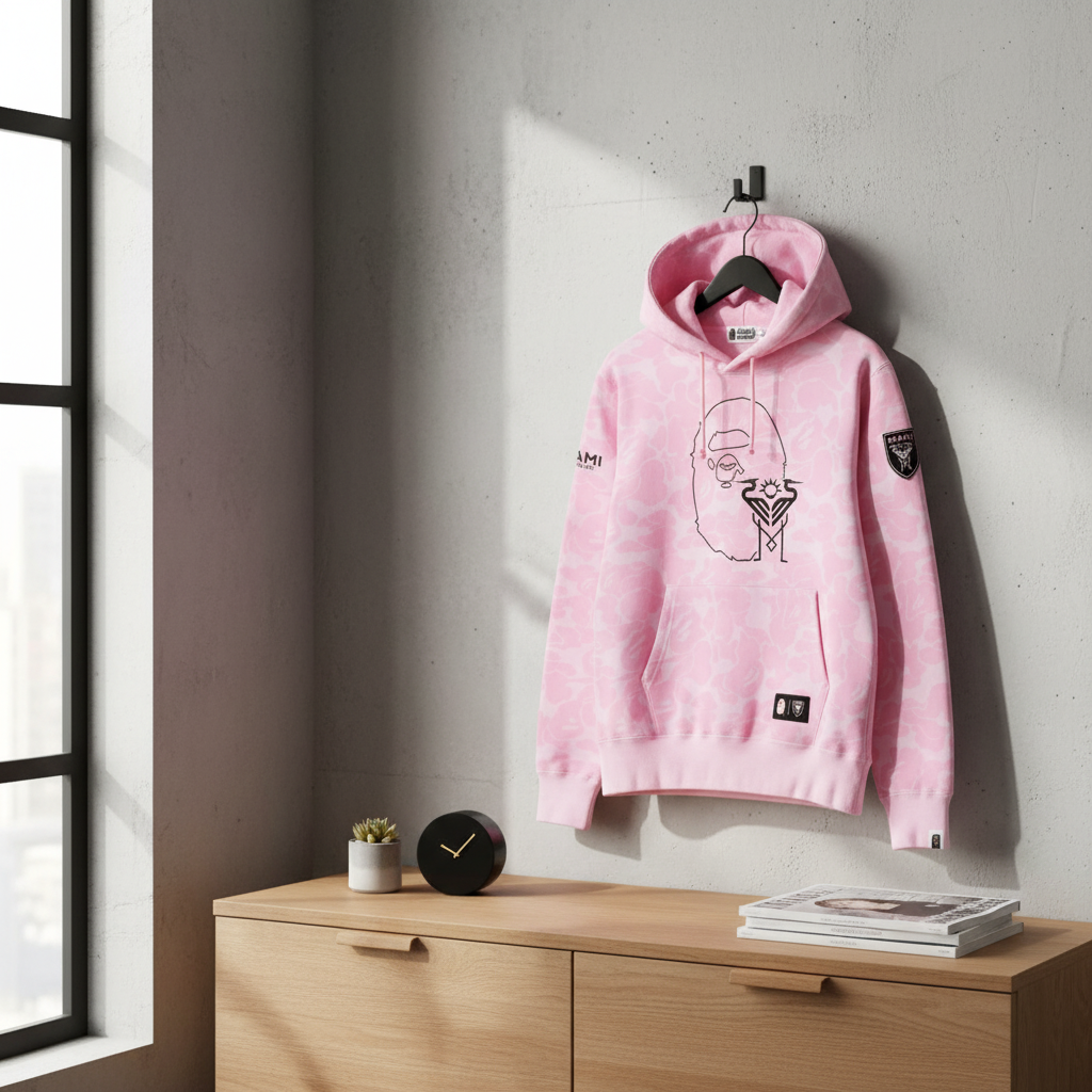 A Bathing Ape Pink Camo Hoodie, soft breathable cotton, iconic Ape Head print, logo patches on sides and pocket, drawstring hood, kangaroo pocket, unisex streetwear for everyday casual style.