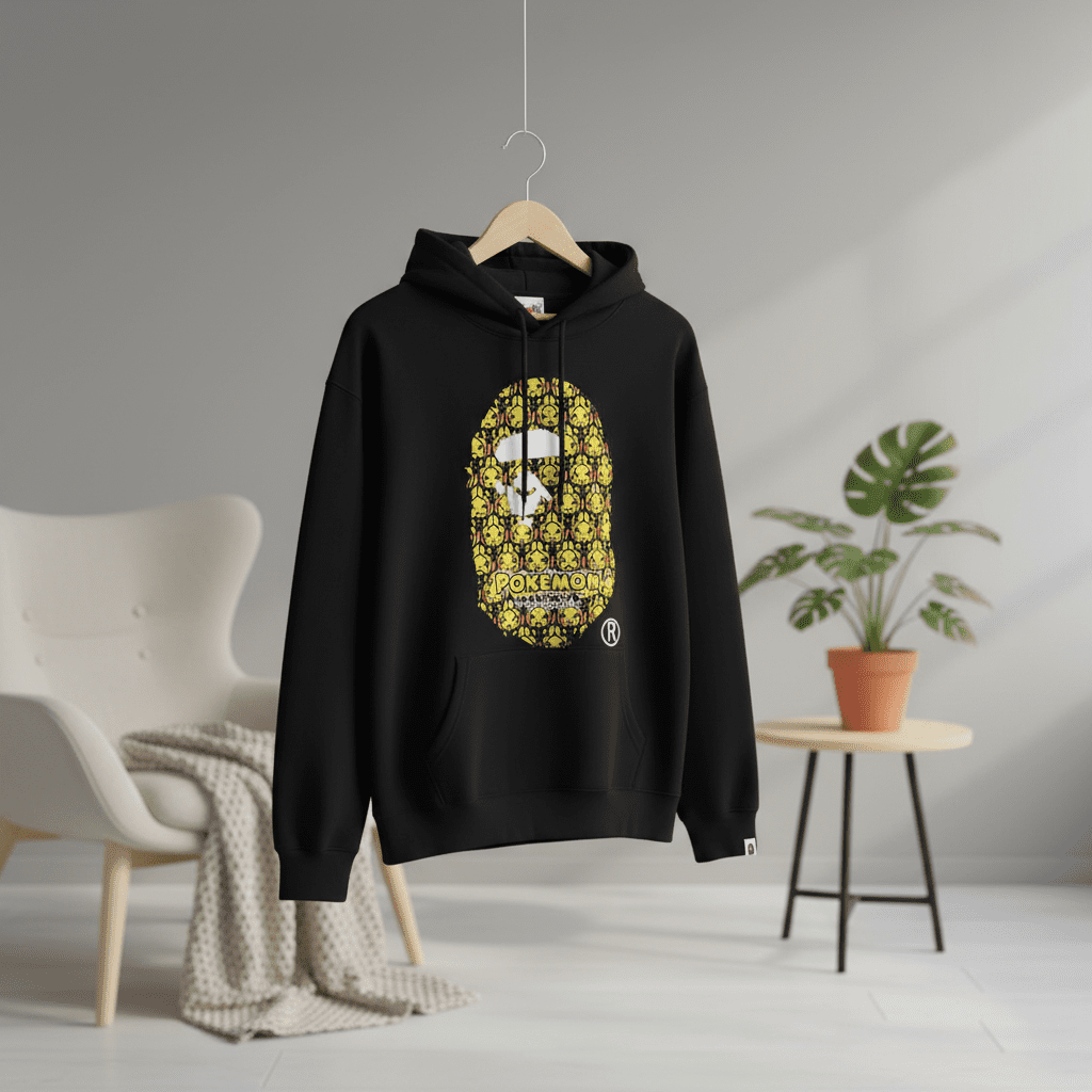 A Bathing Ape x Pokémon Black Hoodie, premium soft cotton, Ape Head with yellow Pikachu print and Pokémon logo, unisex streetwear style, comfy daily wear with bold personality.