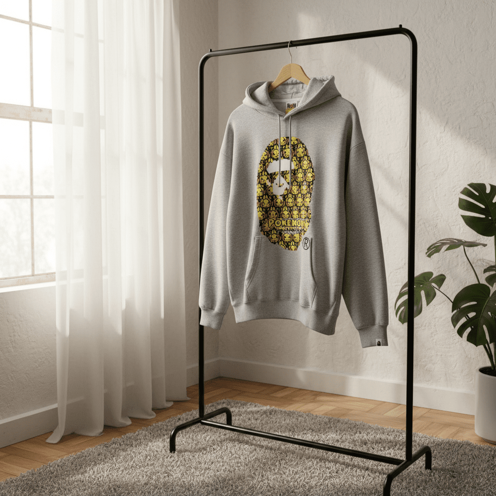 A Bathing Ape x Pokemon gray hoodie made of soft breathable cotton with adjustable drawstring hood, kangaroo pocket, featuring Ape Head fused with Pikachu graphic, unisex streetwear style.