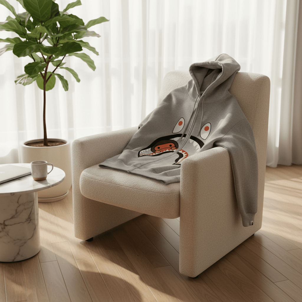A Bathing Ape Shark Mouth Gray Hoodie features soft breathable cotton, iconic shark and monkey print, drawstring hood, kangaroo pocket, unisex design, perfect for streetwear style.