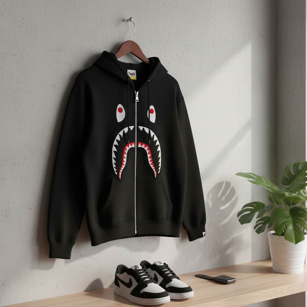 A Bathing Ape Shark Series black zip-up hoodie, soft cotton fabric for comfort, iconic shark design, unisex streetwear style, perfect for daily casual wear and keeping warm with trend appeal.