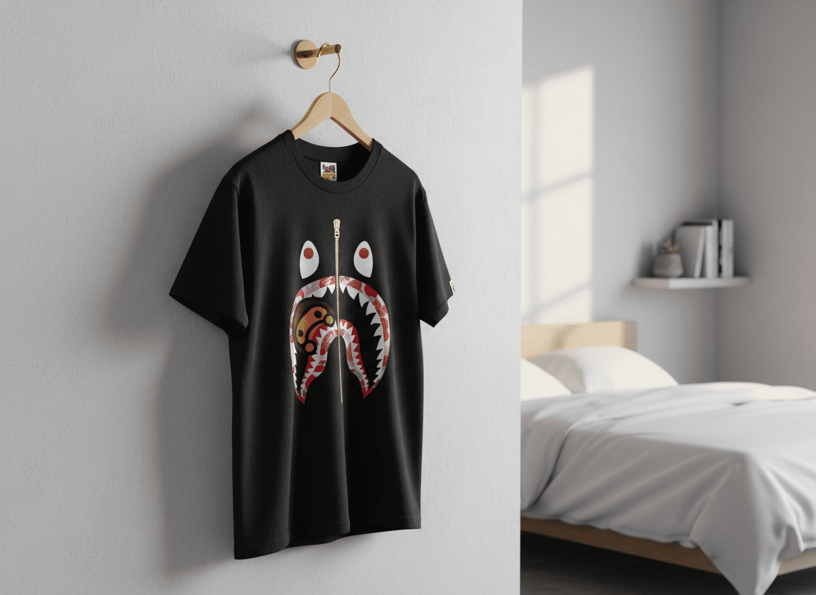 A Bathing Ape Shark Series Black T-Shirt made of premium breathable cotton, features iconic shark zipper design with ape motif, street fashion style, unisex fit, expressing bold urban individuality.