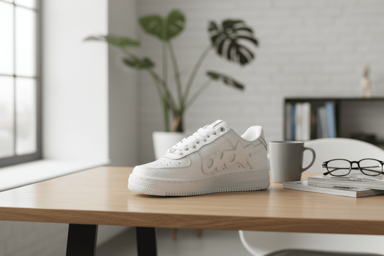 A Bathing Ape white crocodile-textured leather sneakers feature iconic logo design, unisex streetwear style, comfortable fit for daily wear, showcasing trendy and bold fashion attitude.