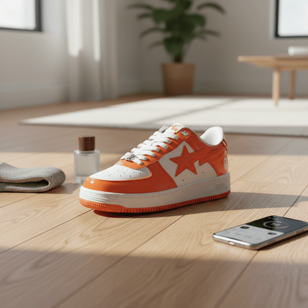 A Bathing Ape BAPE STA Orange White Sneakers, featuring patent leather and leather mix, signature star logo and ape head detail, street fashion style, unisex, comfy for daily wear and trendy look.