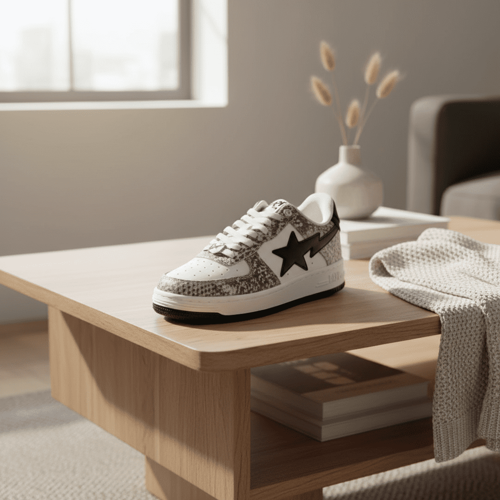 BAPE Snake Pattern Gray White Black Sneakers crafted from premium leather, featuring iconic black star motif and BAPE logo sole. Unisex streetwear style, comfy and versatile for daily casual fashion.