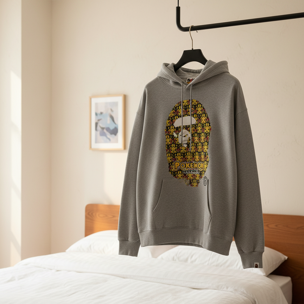 BAPE x Pokemon gray hoodie features soft cotton fabric, Pikachu print inside the Ape Head logo, “POKEMON” lettering, drawstring hood, kangaroo pocket, unisex streetwear look.