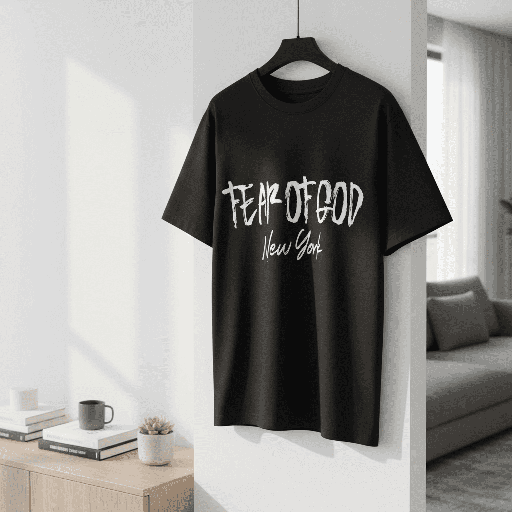 Fear of God Essentials black cotton T-shirt featuring New York graffiti-style print on back, breathable and soft fabric, unisex design perfect for daily casual streetwear style.