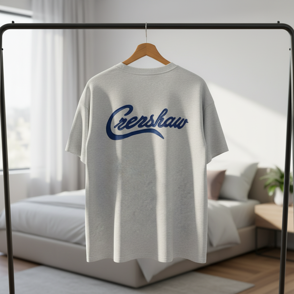 Essentials Grey Cotton T-Shirt with Blue “Crenshaw” Embroidery, Street Style Unisex Tee, Soft Breathable Fabric, Perfect for Daily Casual Wear with Trendy Urban Appeal.