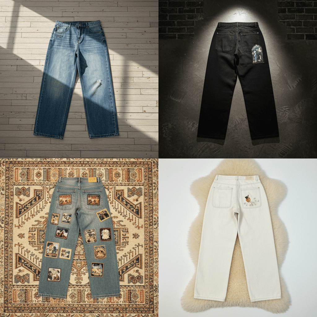 Step into style with vintage-inspired denim jeans, featuring multicolor embroidery & unique patchwork for a relaxed, trendy look.