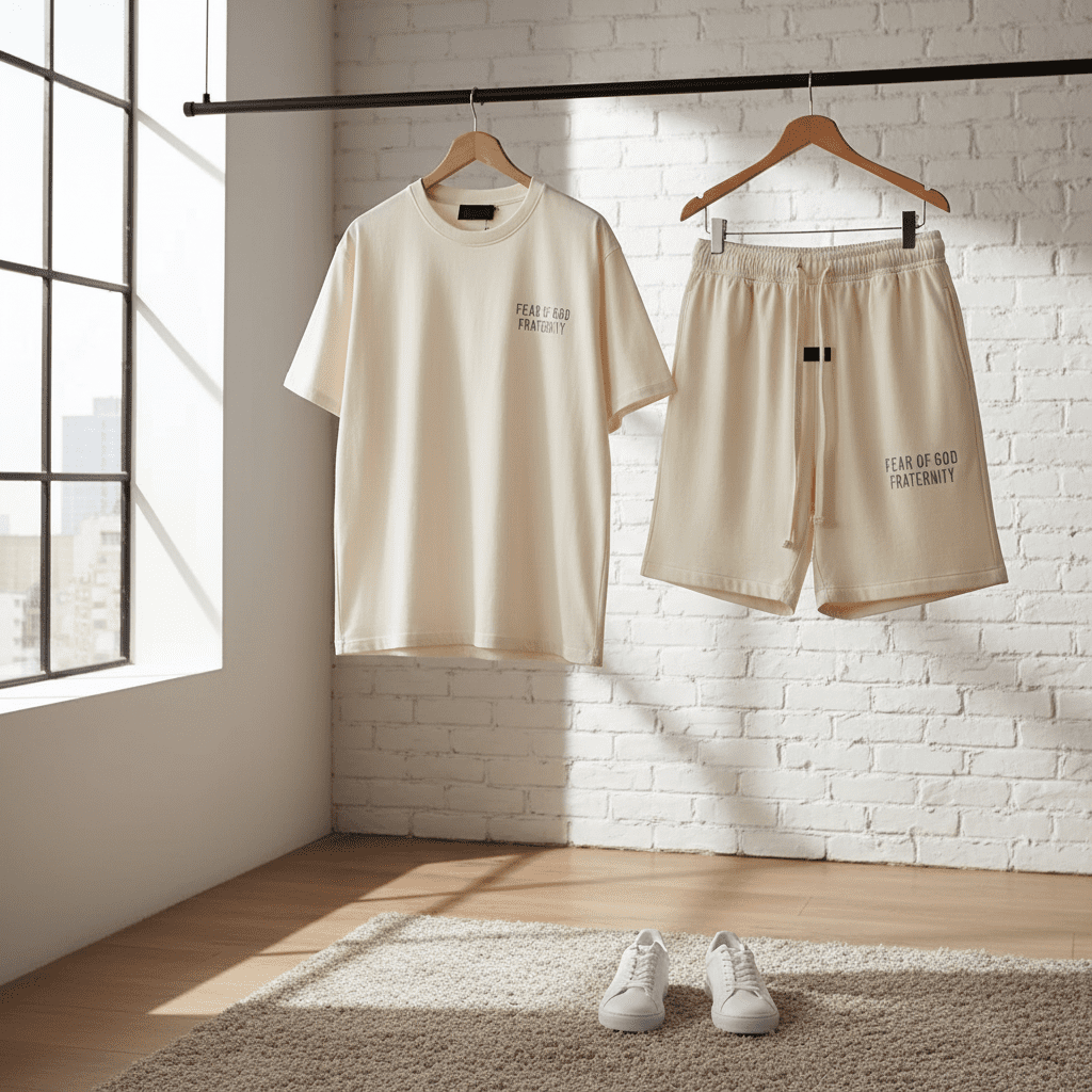 Fear of God Essentials off-white T-shirt and shorts set, soft breathable cotton, logo graphic print, unisex streetwear style, comfortable daily outfit for men and women.
