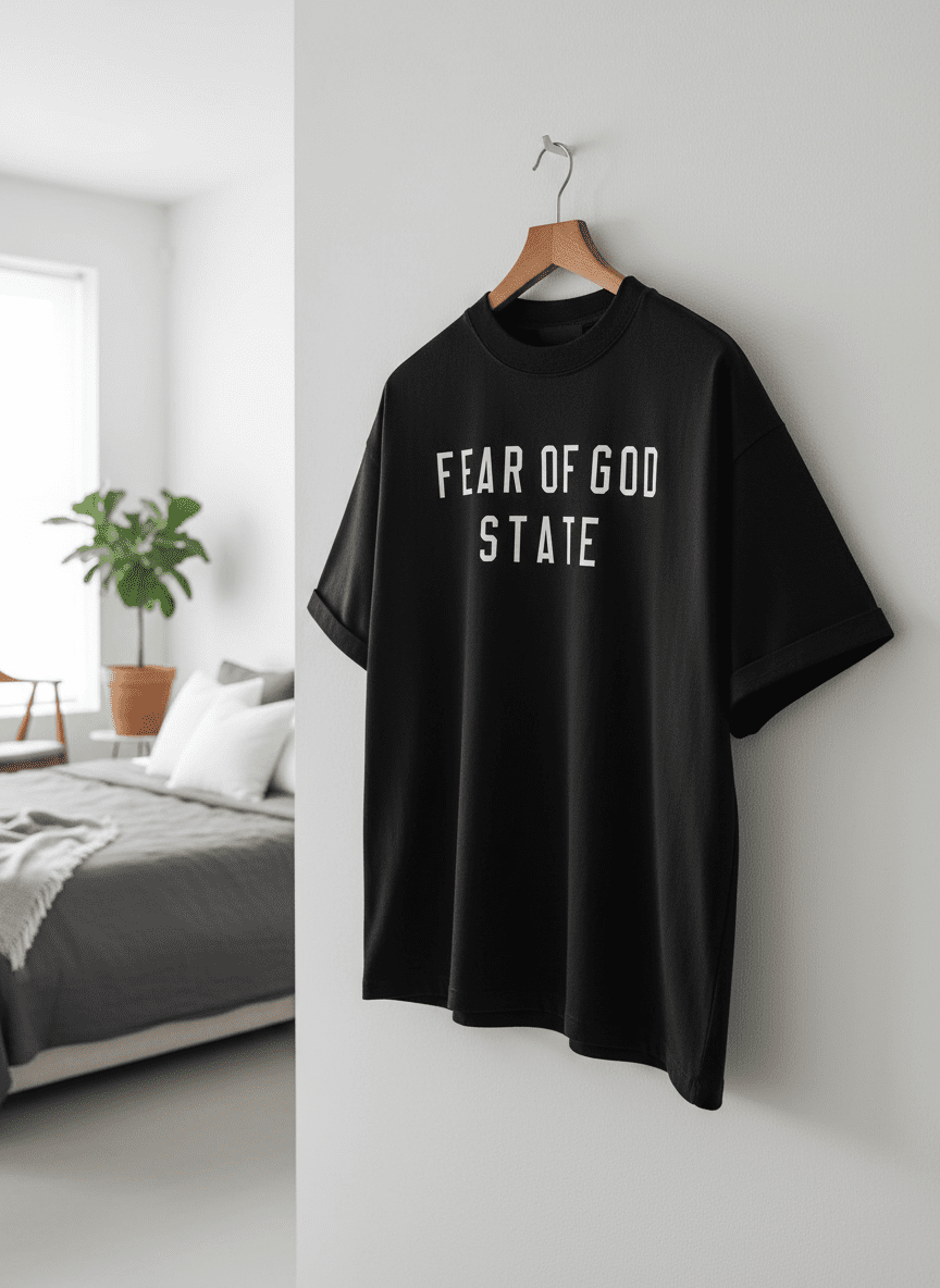 Fear of God Essentials black T-shirt, premium cotton, relaxed fit, round neck, “FEAR OF GOD STATE” print, unisex streetwear style, breathable and comfortable for daily casual wear.