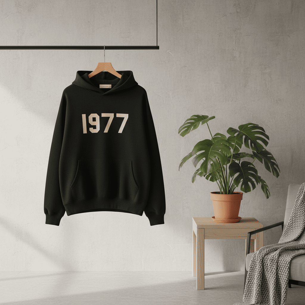 Essentials black hoodie crafted from premium cotton features a drawstring hood, bold 1977 graphic, and kangaroo pocket. Unisex streetwear style blends retro charm with everyday comfort.