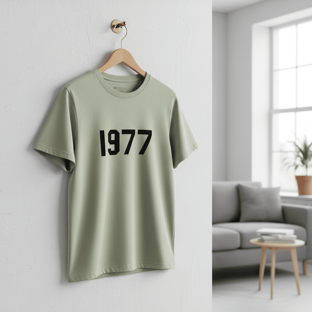 Essentials Beige 1977 T-Shirt, made of soft breathable cotton, features bold black “1977” print, unisex design, casual classic fit, versatile for everyday wear with a retro streetwear vibe.