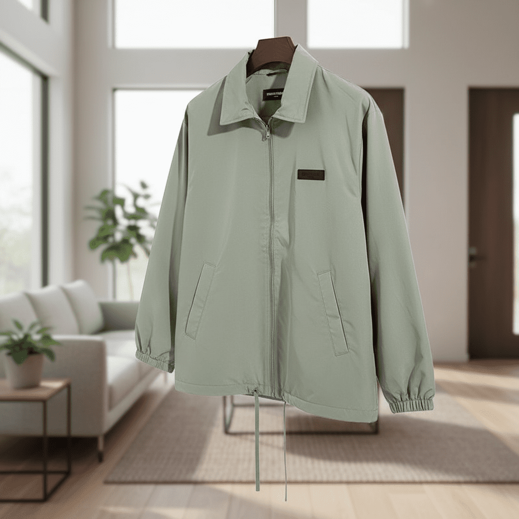 Essentials Light Gray Windbreaker Jacket, breathable fabric with stand collar and drawstring hem, features bold 1977 graphic on back, unisex streetwear style, stylish and functional for everyday wear.