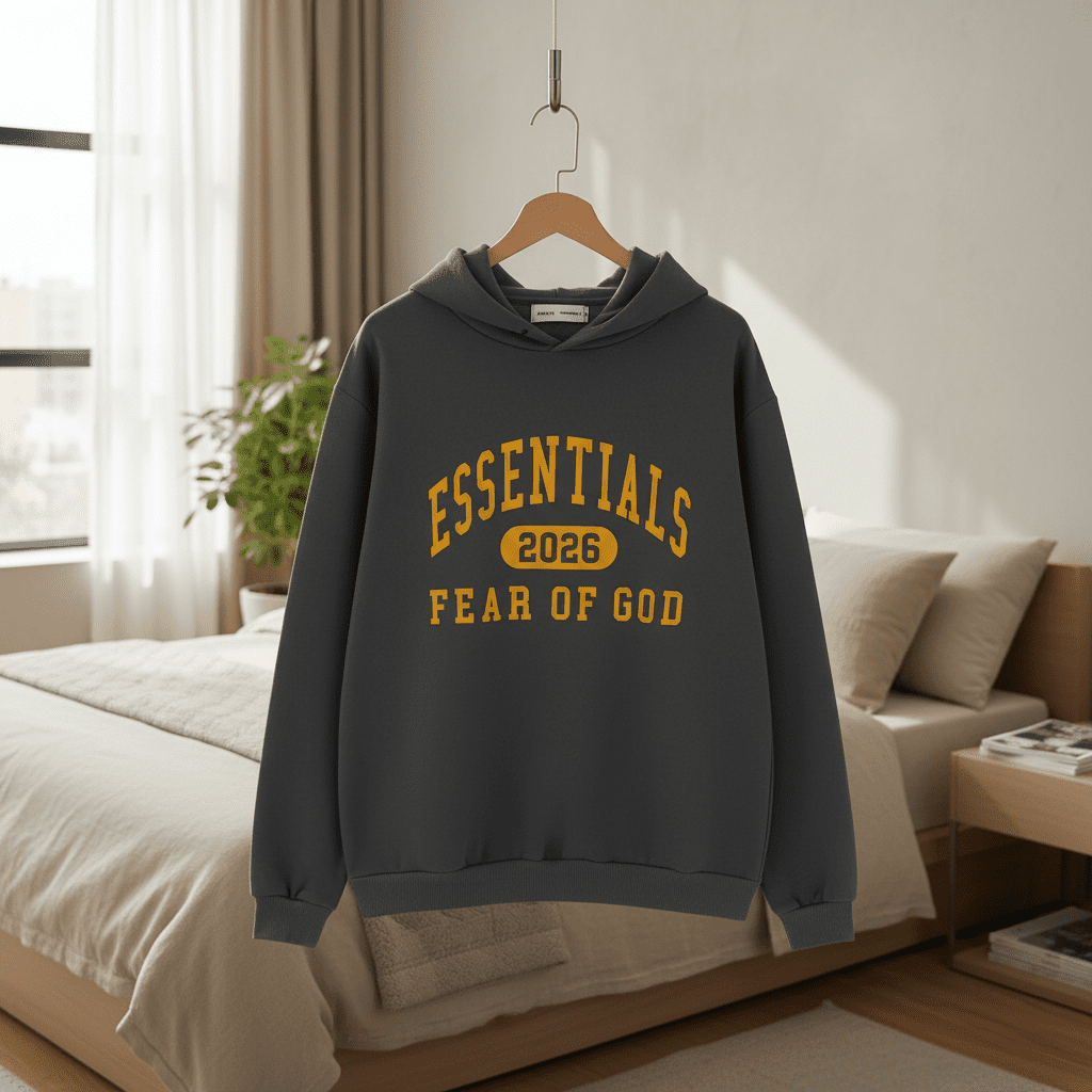 Fear of God Essentials Dark Gray Hoodie 2026, made from premium cotton for soft comfort. Features bold yellow “ESSENTIALS 2026 FEAR OF GOD” print, unisex streetwear style, perfect for daily casual wear.