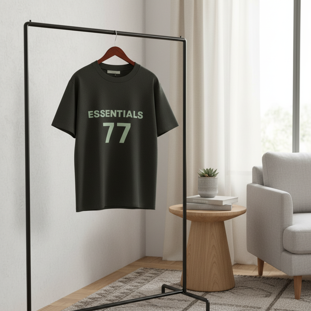 Essentials Black Cotton T-Shirt featuring “ESSENTIALS 77” print. Soft, breathable, unisex crew neck design for daily streetwear style—comfortable, trendy, and effortlessly cool.