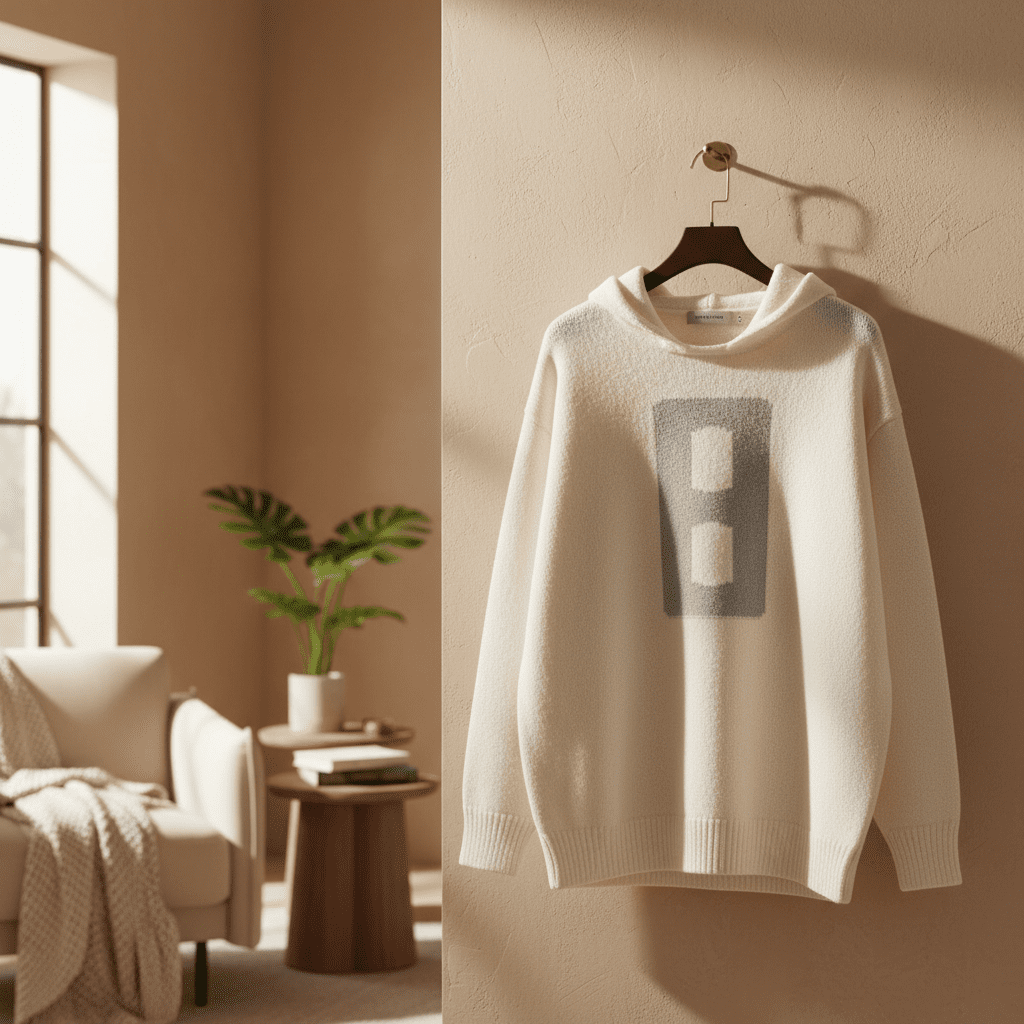 Essentials Off-White Knit Hoodie features soft warm fabric, relaxed unisex fit, hooded design, and a gray letter B motif for a minimalist streetwear style that highlights trendy brand personality.