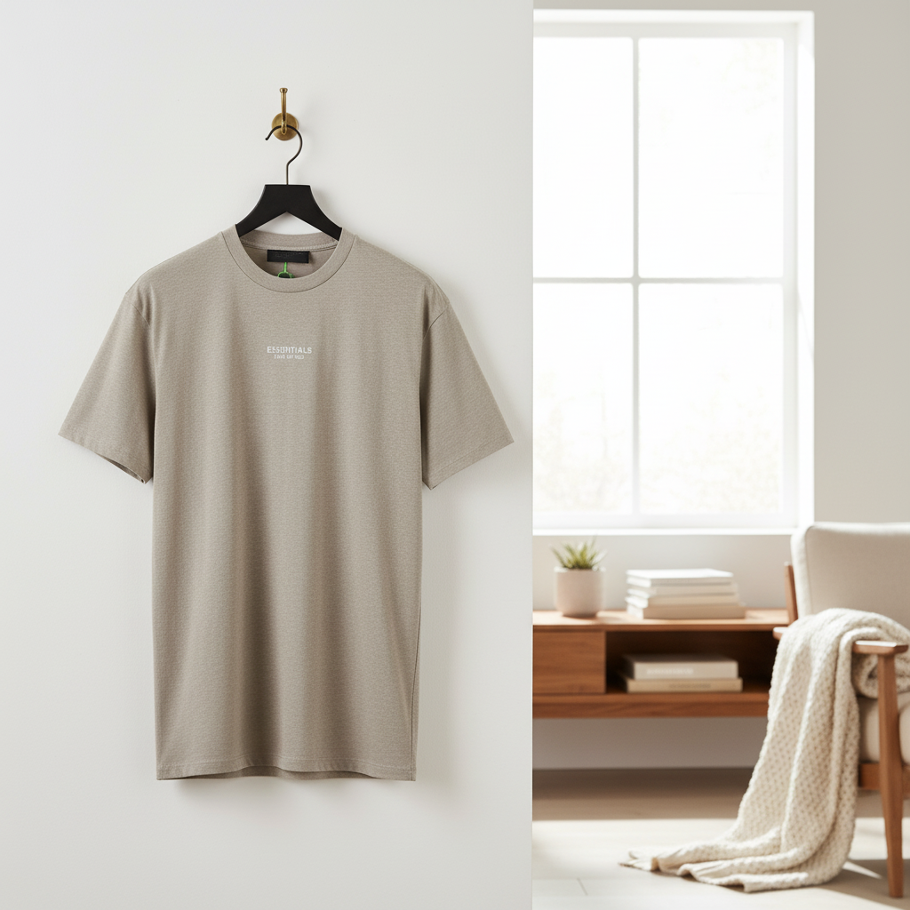 Essentials Khaki Short Sleeve T-Shirt, made from premium cotton with a crew neck and front logo design. Unisex, breathable, and comfortable for daily wear, offering a minimalist casual style.