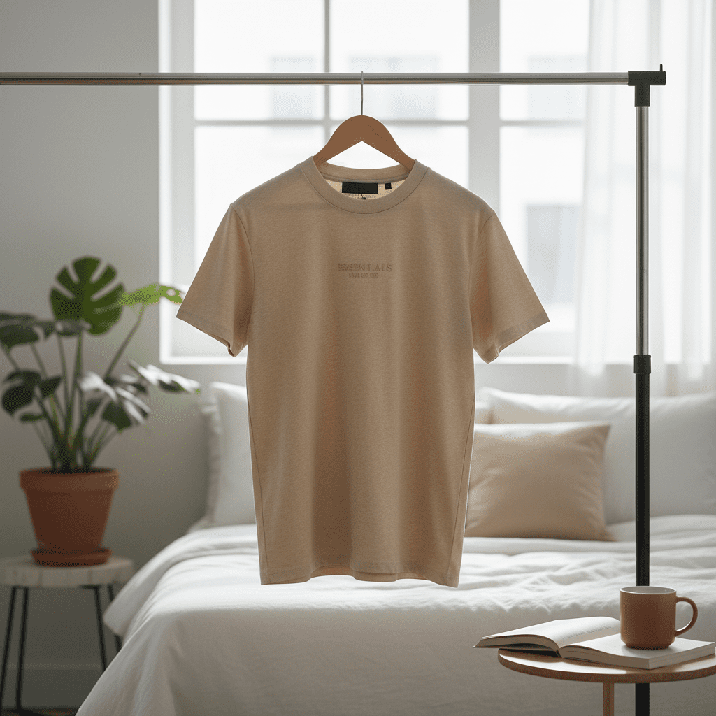Essentials Khaki Short Sleeve T-Shirt, made from soft cotton fabric with a breathable crew neck, features delicate embroidered logo, unisex design, minimalist casual style, perfect for daily wear.