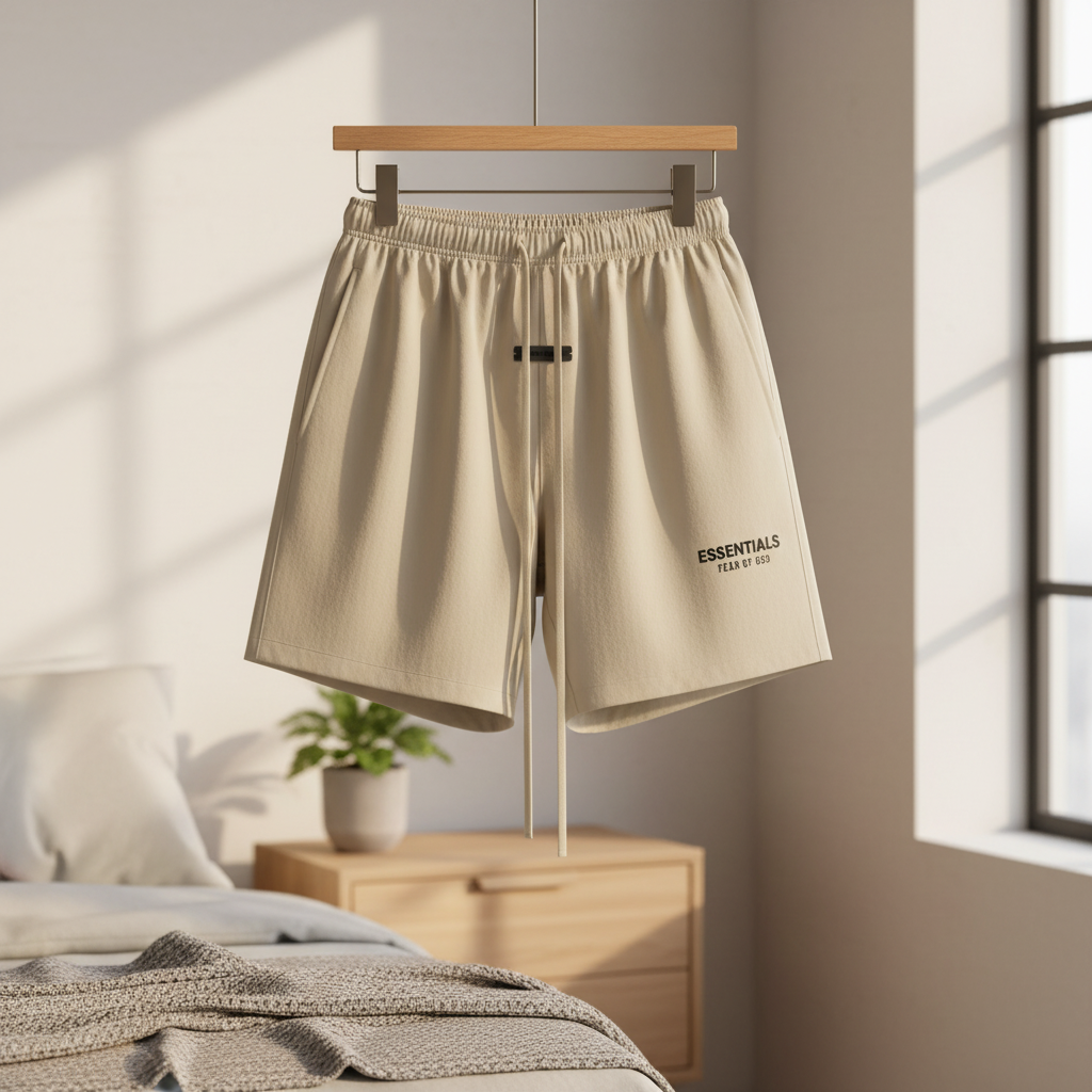 Fear of God Essentials Light Beige Shorts feature smooth lightweight fabric, adjustable drawstring waist with metal tips, logo print on side, unisex street style for everyday comfort and versatility.