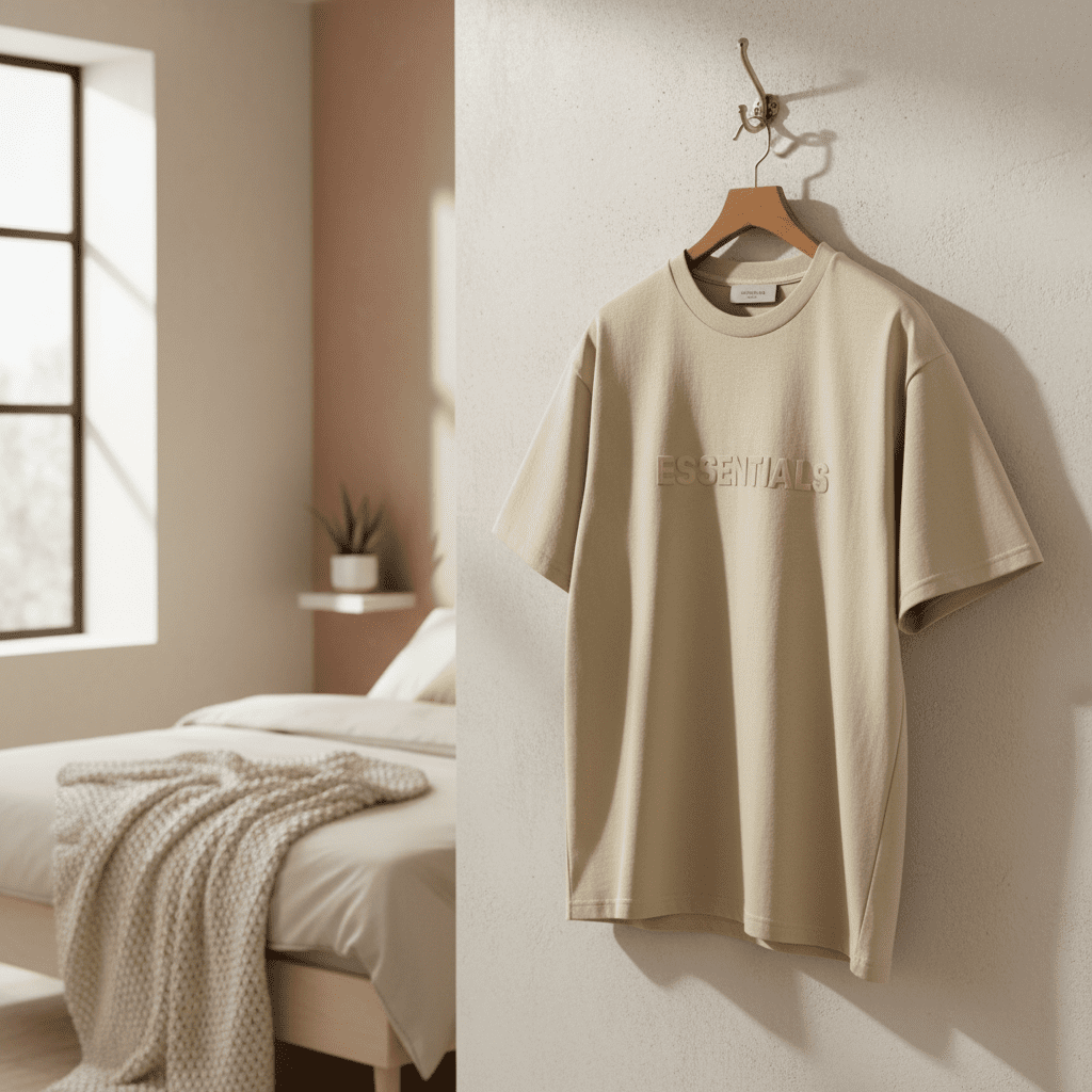 Essentials beige short-sleeve T-shirt made from soft breathable cotton, featuring 3D logo lettering on the chest. Unisex streetwear style, perfect for everyday casual outfits.