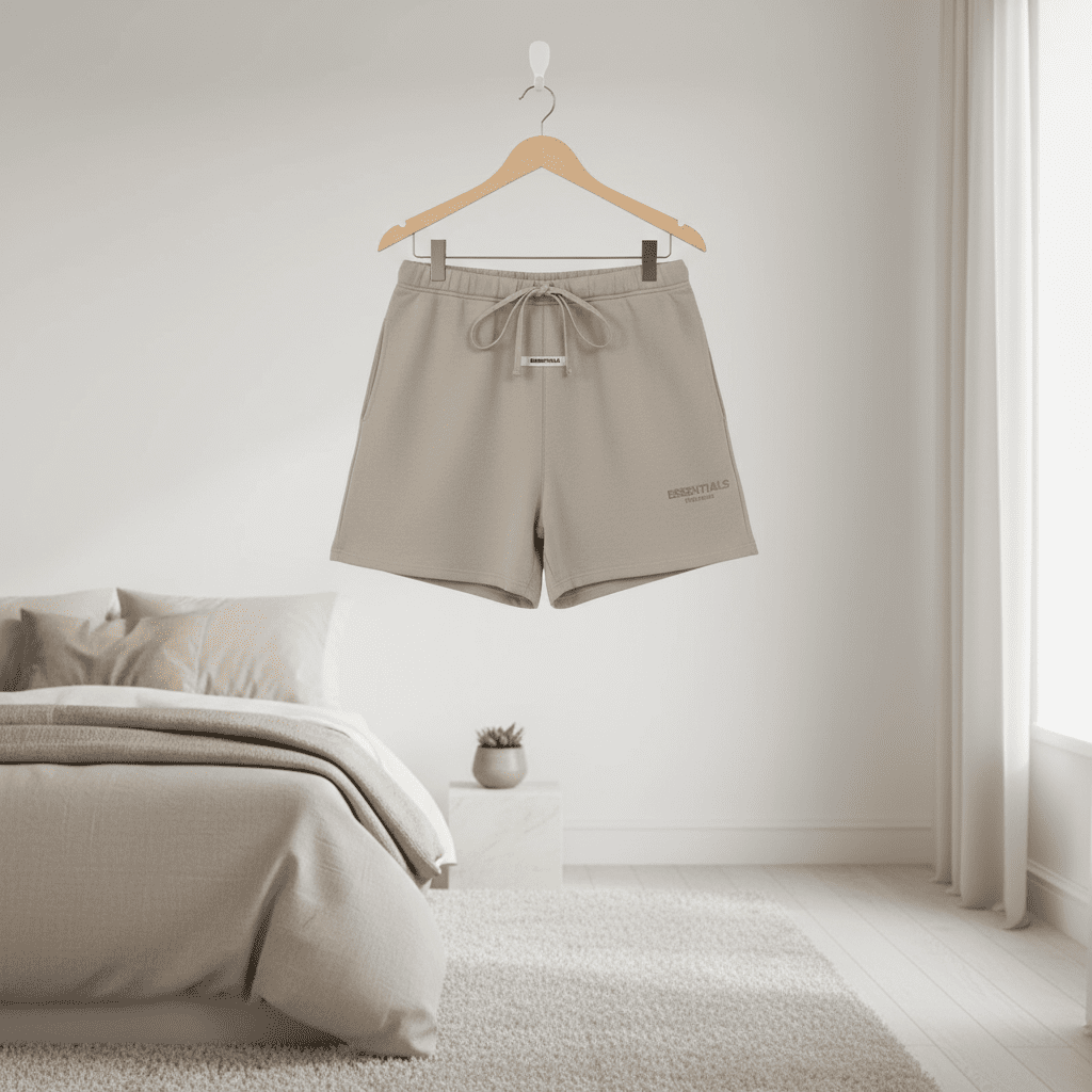Essentials Khaki Cotton Shorts feature a soft fabric, elastic drawstring waist, side logo detail, breathable comfort, unisex design, and minimalist street style for everyday casual wear.