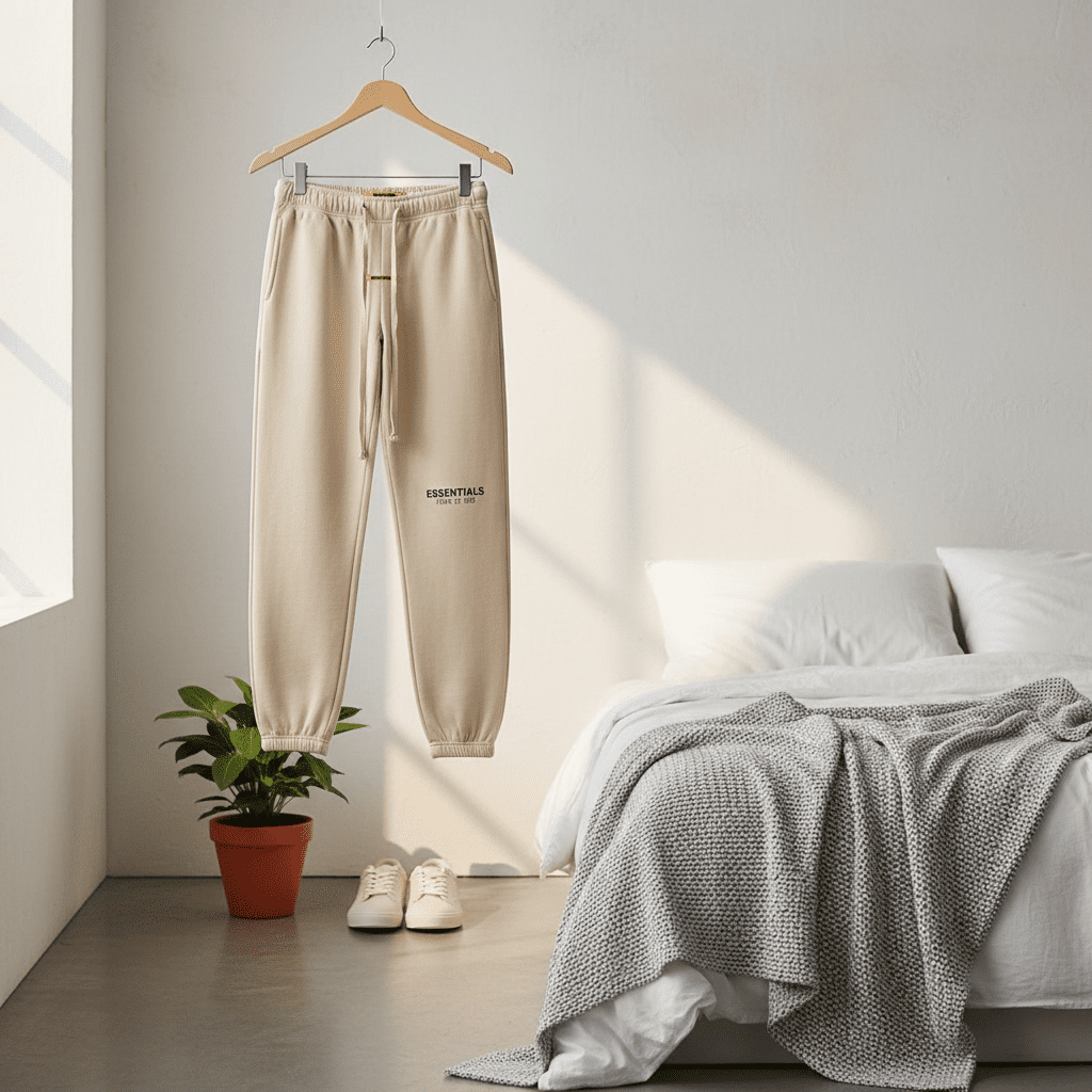 Essentials beige jogger pants, made from soft cotton fabric with adjustable drawstring waist and side pockets, feature signature logo print, streetwear style, unisex, perfect for daily casual wear.
