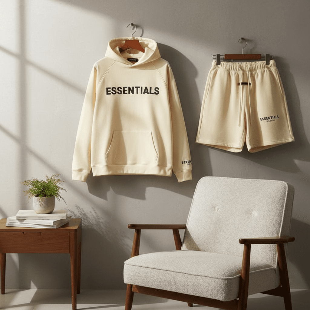 Essentials Cream Hoodie – Soft breathable cotton, bold black logo print, drawstring hood, kangaroo pocket, unisex fit, perfect for streetwear style and everyday casual comfort.