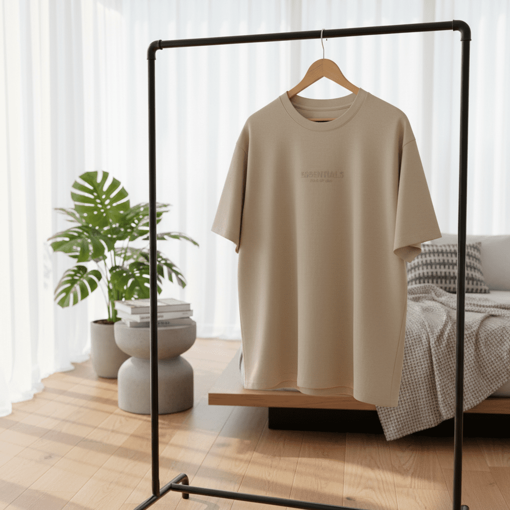Essentials Beige Cotton T-Shirt features soft breathable premium fabric, embossed logo on chest, minimalist street style design, unisex fit, perfect for daily comfortable casual wear.