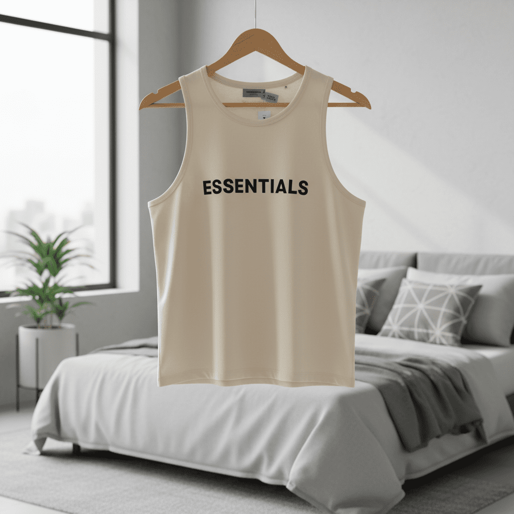 ESSENTIALS Beige Sleeveless Tank Top made of soft cotton, features bold black “ESSENTIALS” logo, breathable and versatile unisex design for casual daily wear with minimalist street style.