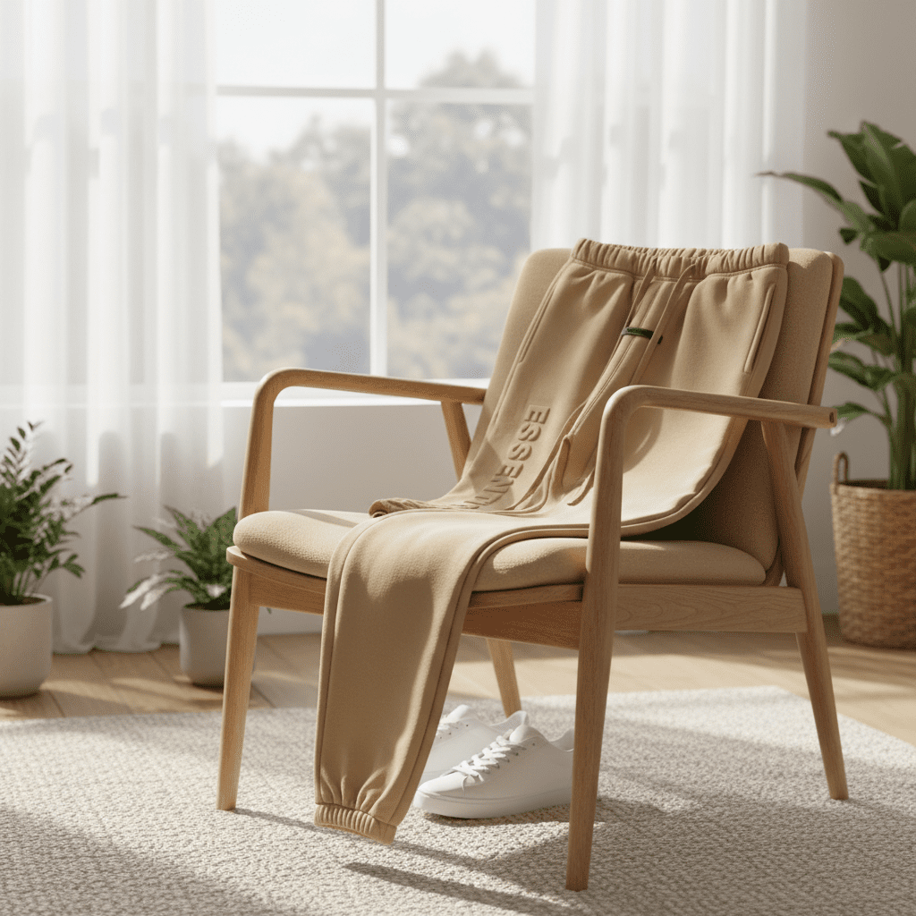Essentials Khaki Jogger Pants made of soft cotton, featuring embossed logo on the side, adjustable drawstring waist, and ankle cuffs. Unisex streetwear style for daily comfort and modern fashion.